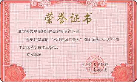 2007年7月,公司“水環(huán)熱泵三效機(jī)”研發(fā)項(xiàng)目,榮獲豐臺(tái)區(qū)科學(xué)技術(shù)獎(jiǎng)三等獎(jiǎng)。