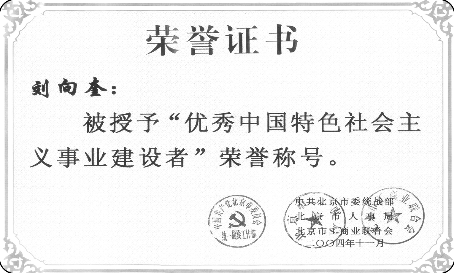 2004年11月,劉向奎總經(jīng)理被北京市委統(tǒng)戰(zhàn)部、人事局、工商業(yè)聯(lián)合會(huì)評(píng)為“優(yōu)秀中國(guó)特色社會(huì)主義事業(yè)建設(shè)者”。